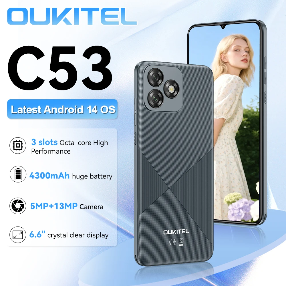 Oukitel C53 Smartphone 6.6" Crystal Clear Display 13MP Telephon Portable 8GB(4+4)+64GB 4300mAh Battery Android 14 Mobile Phone